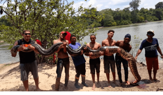 Nos registros feitos pelos próprios envolvidos, é possível ver os homens em uma embarcação quando encontram a cobra de mais de 5 metros em um local que não foi esclarecido.