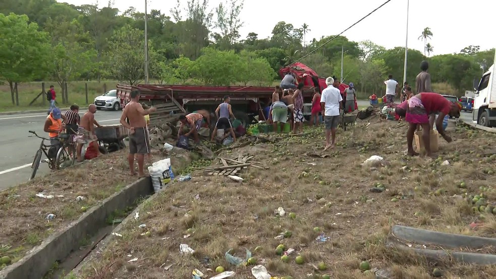 Um caminhão carregado com laranjas tombou, na manhã desta quinta-feira (24), na BR-101, em frente ao Hospital Miguel Arraes, em Paulista, no Grande Recife. Após o acidente, o motorista do veículo permitiu que as pessoas levassem as frutas que ficaram espalhadas pela pista e pelo canteiro da estrada (veja vídeo acima).