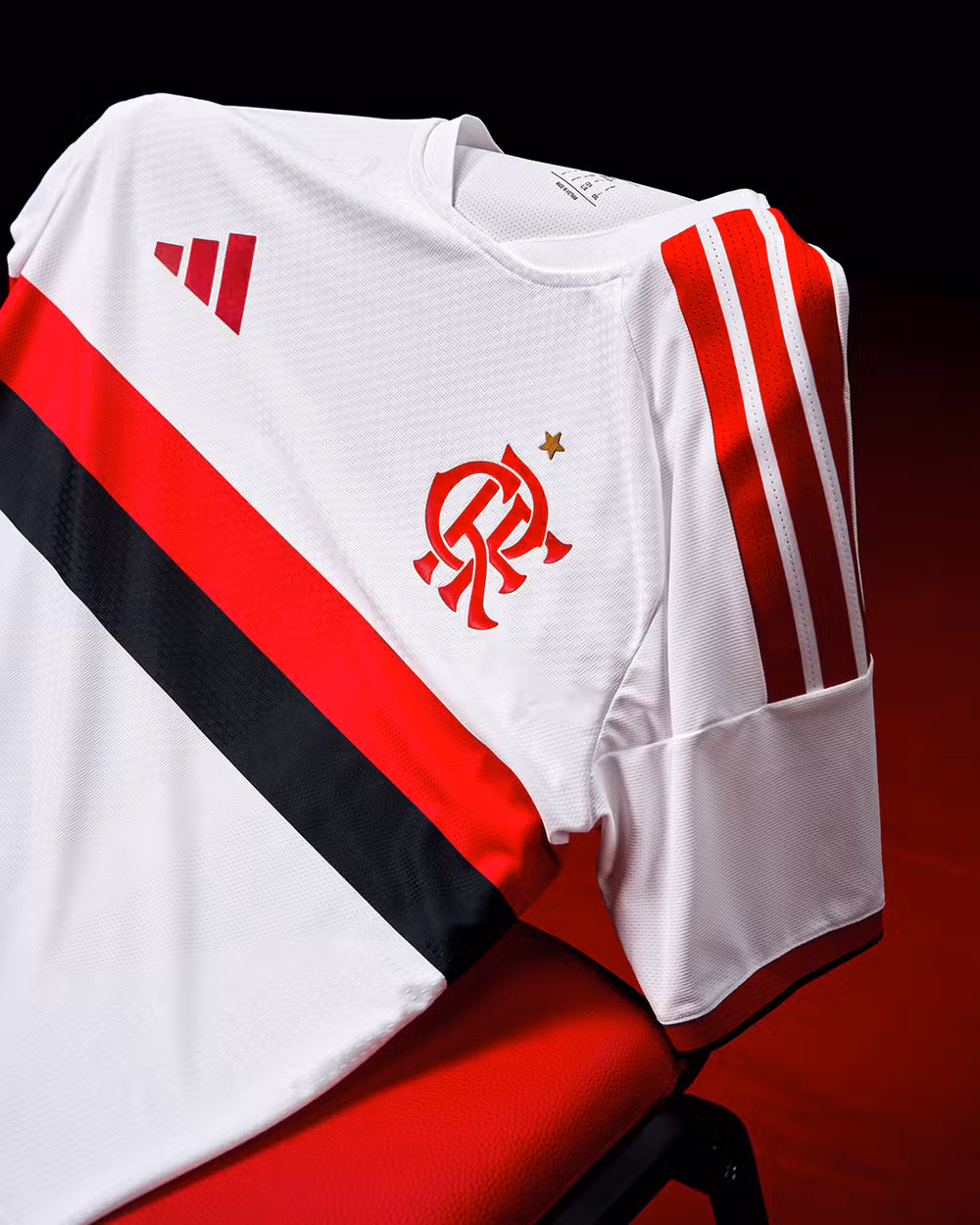 O uniforme está disponível na loja oficial do clube e custa a partir de R$ 449,99 — preço sem personalização para o modelo adulto. A camisa é predominantemente branca e conta com o retorno das faixas rubro-negras no peito, que apareceram pela última vez em 2019, ano histórico para o clube. Nos ombros, as três listras da Adidas, fornecedora do material esportivo, aparecem na cor vermelha. O kit é completo com calção preto e meiões brancos.