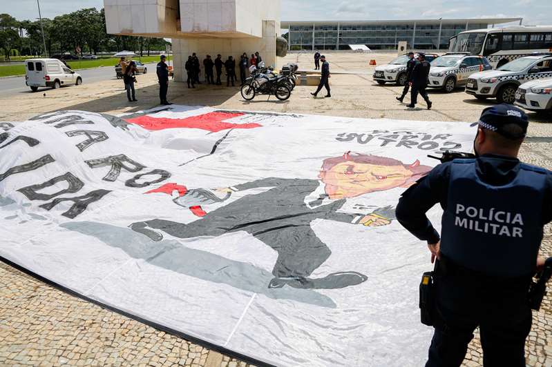 Um grupo de 5 manifestantes foi detido, na manhã desta 5ª feira (18), ao tentar abrir uma faixa com uma suástica, a frase “Bolsonaro Genocida” e uma caricatura do presidente em frente ao Palácio do Planalto.